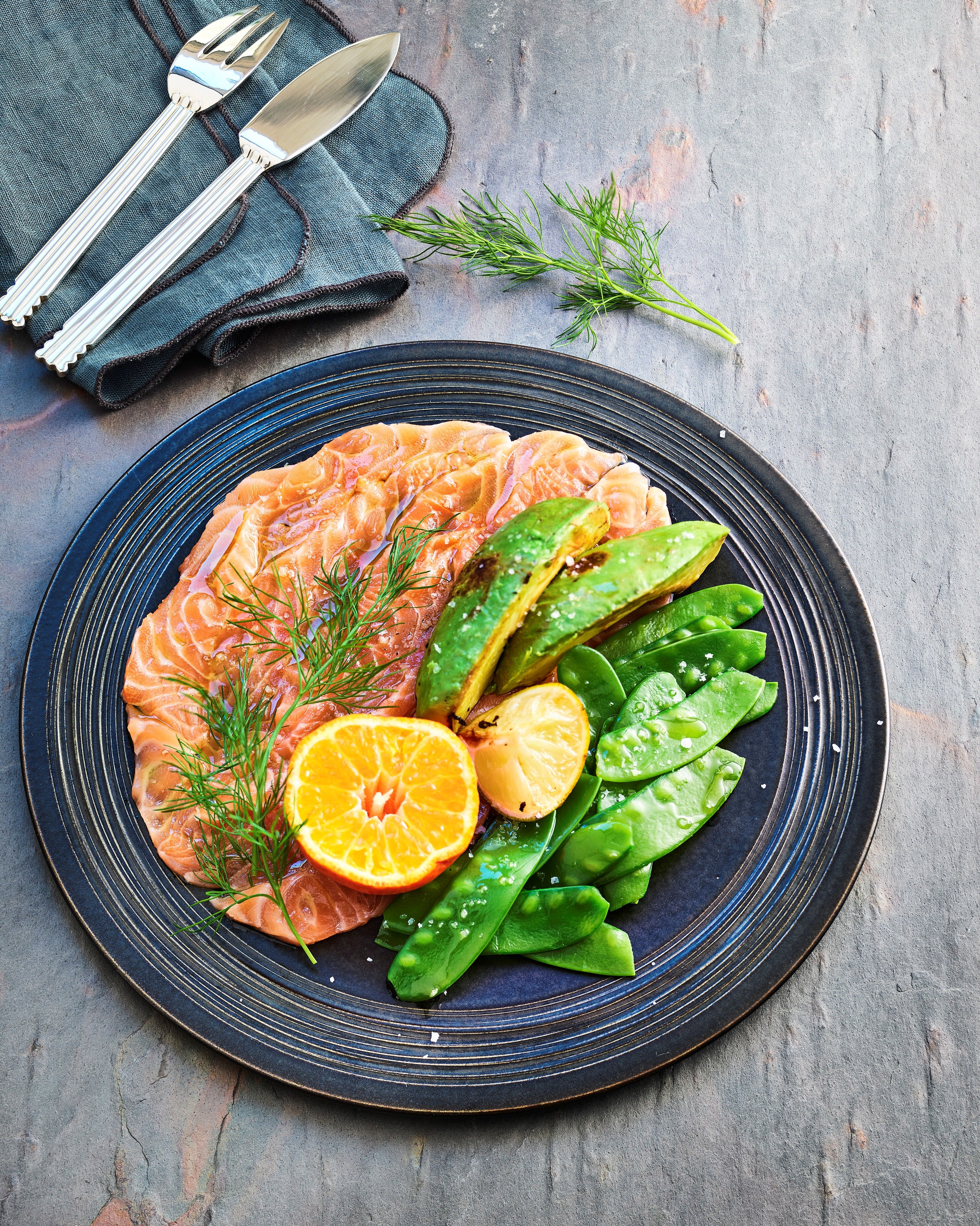 4. Die Avocados der Länge nach vierteln, Schale und Kern entfernen und in einer Pfanne mit etwas Olivenöl von allen Seiten schön anbraten. Zum Schluss die Limettenstücke dazugeben und leicht anbraten. Kaiserschoten, Limettenstücke, Avocado und Mandarinen auf den Lachstellern anrichten, mit Salz würzen, mit Olivenöl beträufeln. Mit Dill dekorieren. Dazu passen alle Brote.